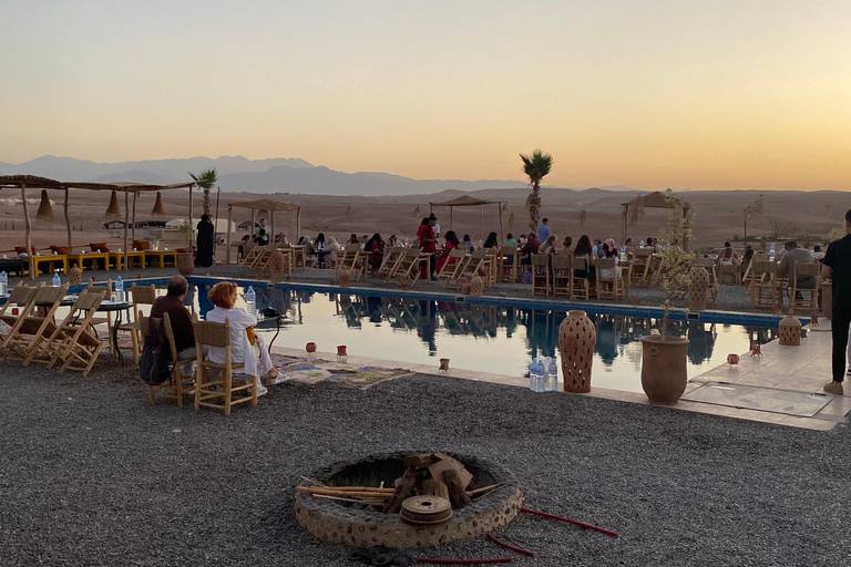Take on a magical journey through the heart of Morocco with our 1001 Nights Marrakech experience. Just 40 minutes from the bustling city of Marrakech, you’ll find yourself transported to the serene and stony desert of Agafay. Choose your mode of adventure: a comfortable Mercedes Vito or a thrilling WWII sidecar. After arriving, have a camel ride in the dusk and return to your camp to find a Gnaoua band playing music as you drink fresh mint tea. Talk to a Berber woman while she bakes bread in a traditional clay oven that you may taste after dipping in virgin oil. After meeting a tattoo artist who will offer several ideas for a unique henna design, enjoy a set menu meal in a secluded tent with entertainment provided by a fire eater and belly dancer.
